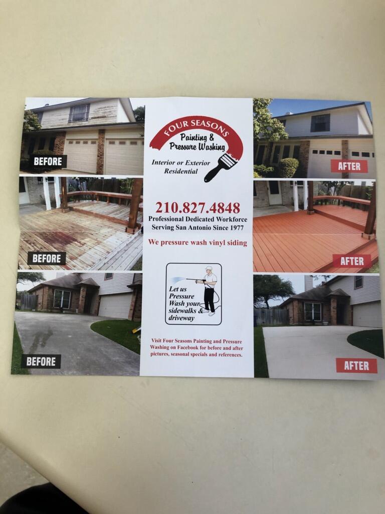 Ad Free Estimate from Painting Contractors in Your Area. 8 recommendations for Four Seasons Painting Pressure Washing from neighbors in San Antonio TX. 4 Seasons Stain and Paint Restoration is a full-service contractor.